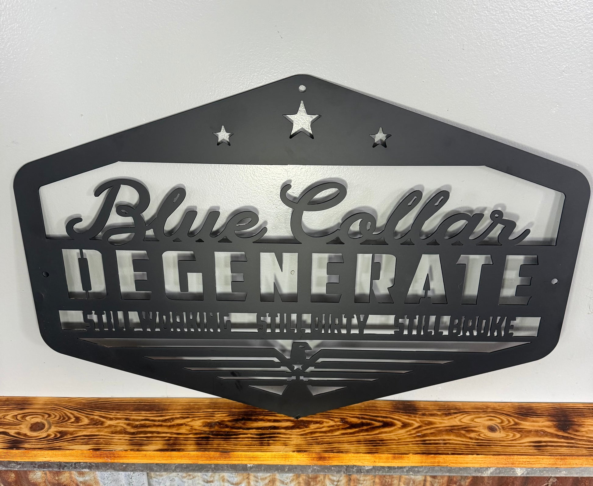 Blue Collar Degenerate - enough said. Put up this sign and it will be a statement piece for sure. Or give as a gift to someone who will really appreciate it! This sign will stand out for all who walk in the door and it will be talked about for a long time! It’s the perfect way to show off your personality; plus, the metal construction ensures it will last for years to come.
