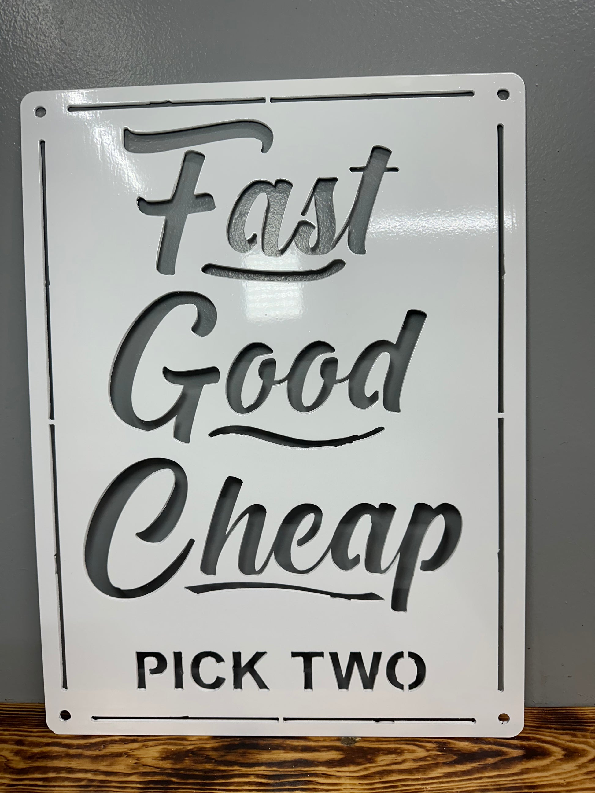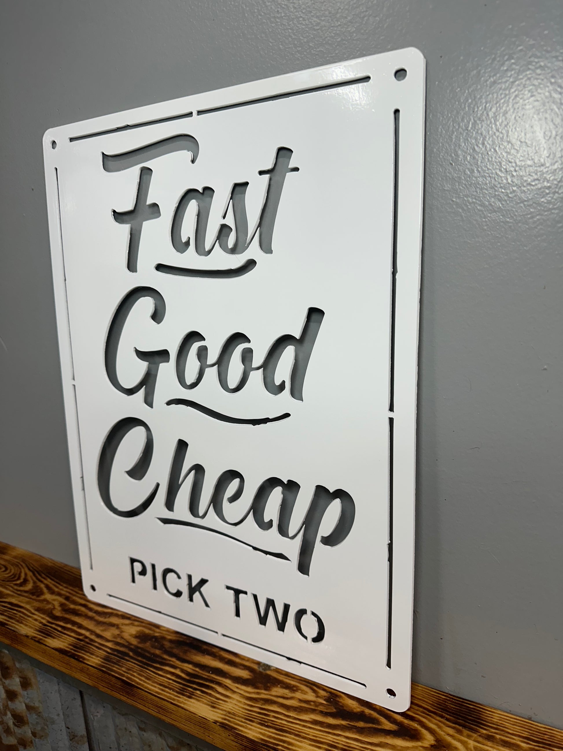 Fast, Good, Cheap, however you want to see it. Add this sign to your space to make a statement or just conversation starter. The metal construction with the powder coat will make sure this sign lasts for years to come!