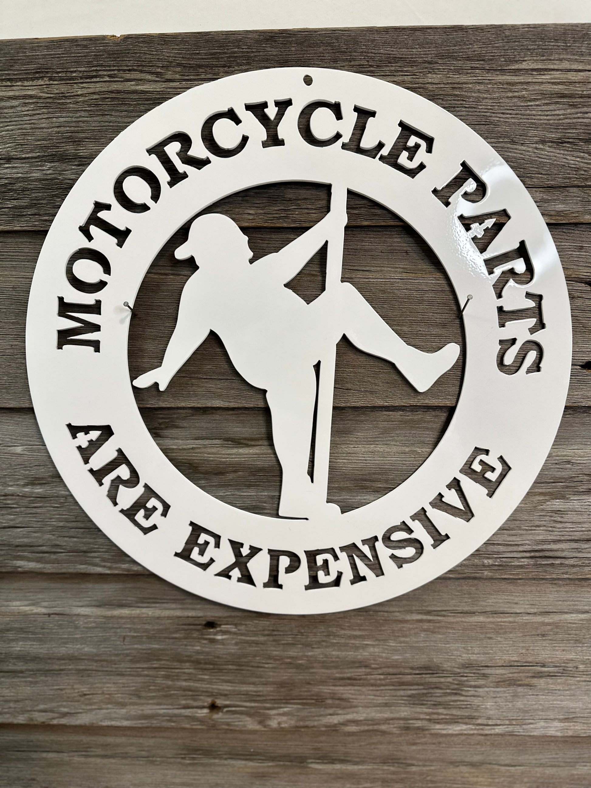 Add some personality to your garage, man cave or shed with this one-of-a-kind custom metal sign. The sign features a playful design of a man on a stripper pole, with the bold text "Motorcycle Parts Are Expensive" displayed below. This sign is made from 14 gauge metal, and powder coated for a long life of wear and tear.